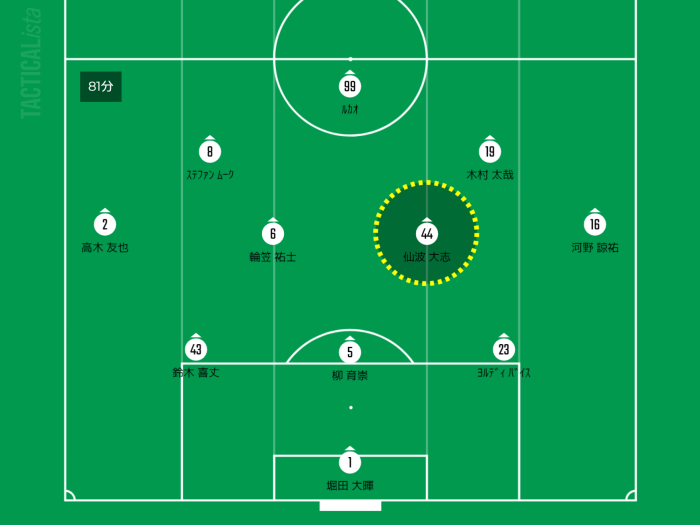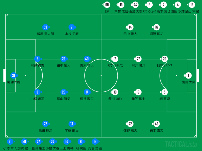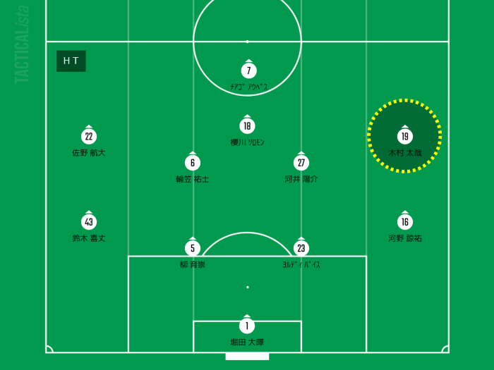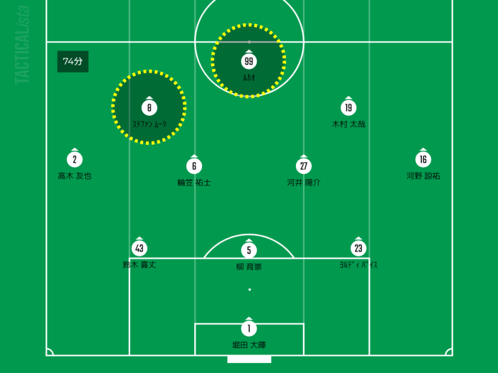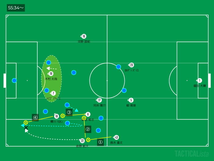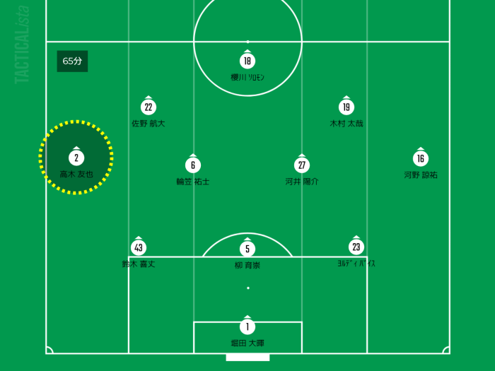 ・65分にチアゴ⇔高木。高木が左WBに入ると、再び1列上がったソロモンによる1トップと、佐野と木村によるセカンドトップが組まれる。高木は佐野とは異なるドリブル突破とクロス・対人守備の特徴を発揮しつつ、チャンスに絡んでいく。鈴木や佐野といった前後の選手とのコンビネーションも良好。▼